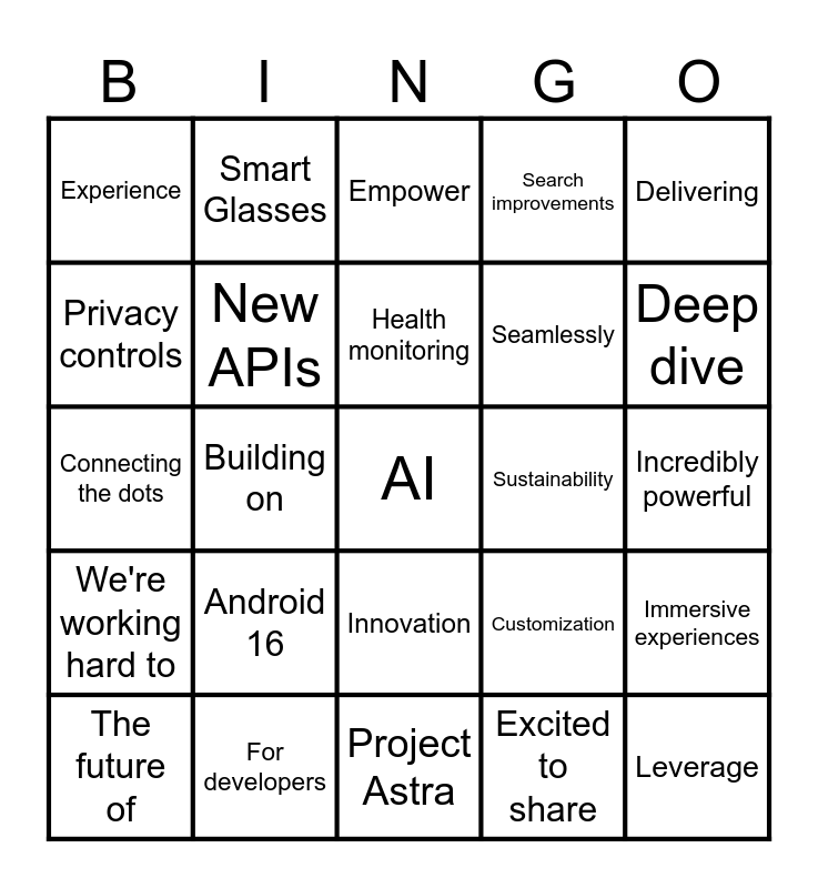 This bingo card has 50 words: Pivoting, AI, Gemini, Project Astra, Android 16, Wear OS, Smart Glasses, Pixel, Privacy controls, Developer tools, New APIs, Search improvements, Immersive experiences, Customization, Productivity, Accessibility, Health monitoring, Sustainability, "One more thing...", Delivering, Building on, Excited to share, Experience, Seamlessly, Magical, Leverage, Deep dive, Game-changer, Empower, Innovation, Intuitive, Transform, We believe, This is just the beginning, For developers, Across all your devices, Privacy first, Making it easier, Here's a look, Incredibly powerful, And that's not all, Real-world scenarios, Ecosystem, Everyday life, The future of, Connecting the dots, Personalization, Optimized for, We're working hard to and User feedback.