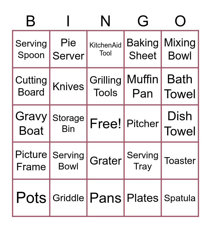 This bingo card has a free space and 42 words: Wine Glasses, Grilling Tools, Luggage, Serving Bowl, Plates, Toaster, Spatula, Bowls, KitchenAid Tool, Grater, Dish Towel, Bath Towel, Storage Bin, Mixing Bowl, Steamer, Serving Tray, Espresso Cups, Gravy Boat, Toaster Oven, Pie Server, Cutting Board, Espresso Machine, Dutch Oven, Serving Spoon, Shovel, Scissors, Muffin Pan, Ice Bucket, Cook Book, Can Opener, Bar Tools, Picture Frame, Knives, Pans, Waffle Iron, Pots, Griddle, Pitcher, Vacuum, Dutch Oven, Baking Sheet and Tupperware.