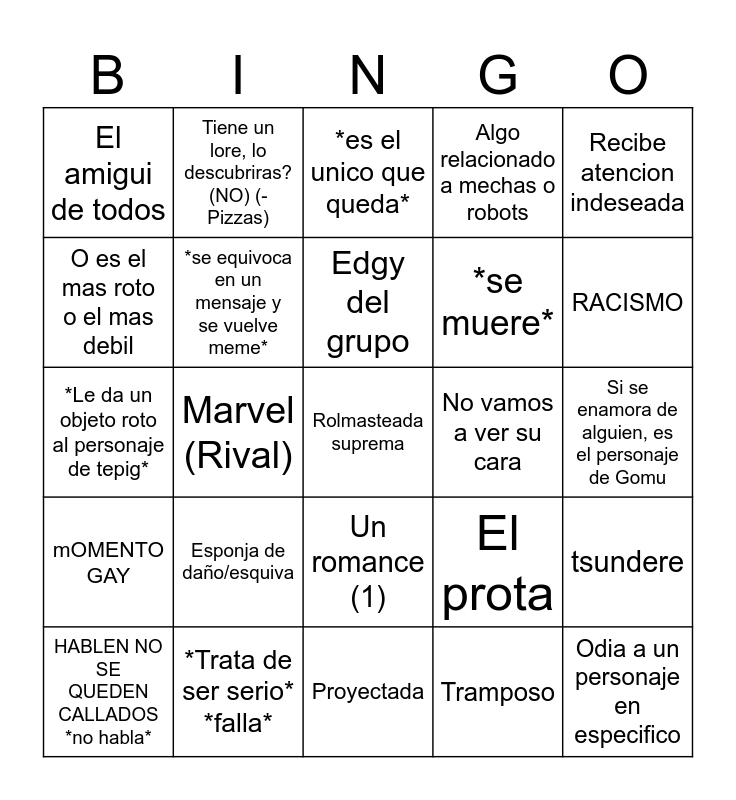 This bingo card has a free space and 24 words: Esponja de daño/esquiva, *Trata de ser serio* *falla*, Edgy del grupo, HABLEN NO SE QUEDEN CALLADOS *no habla*, Recibe atencion indeseada, El amigui de todos, O es el mas roto o el mas debil, Tiene un lore, lo descubriras? (NO) (-Pizzas), No vamos a ver su cara, Un romance (1), *se muere*, *Le da un objeto roto al personaje de tepig*, El prota, tsundere, *se equivoca en un mensaje y se vuelve meme*, Tramposo, Si se enamora de alguien, es el personaje de Gomu, *es el unico que queda*, RACISMO, Marvel (Rival), Odia a un personaje en especifico, mOMENTO GAY, Algo relacionado a mechas o robots and Proyectada.