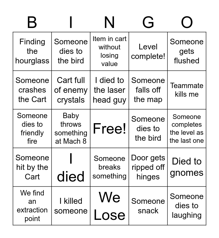 This bingo card has a free space and 24 words: I died, I killed someone, I died to the laser head guy, We find an extraction point, Someone gets flushed, Finding the hourglass, Someone crashes the Cart, Someone dies to the bird, Someone dies to the bird, Someone breaks something, Someone falls off the map, Someone dies to friendly fire, Door gets ripped off hinges, Died to gnomes, Cart full of enemy crystals, Someone snack, Someone completes the level as the last one, Item in cart without losing value, Teammate kills me, Baby throws something at Mach 8, Someone dies to laughing, Someone hit by the Cart, Level complete! and We Lose.
