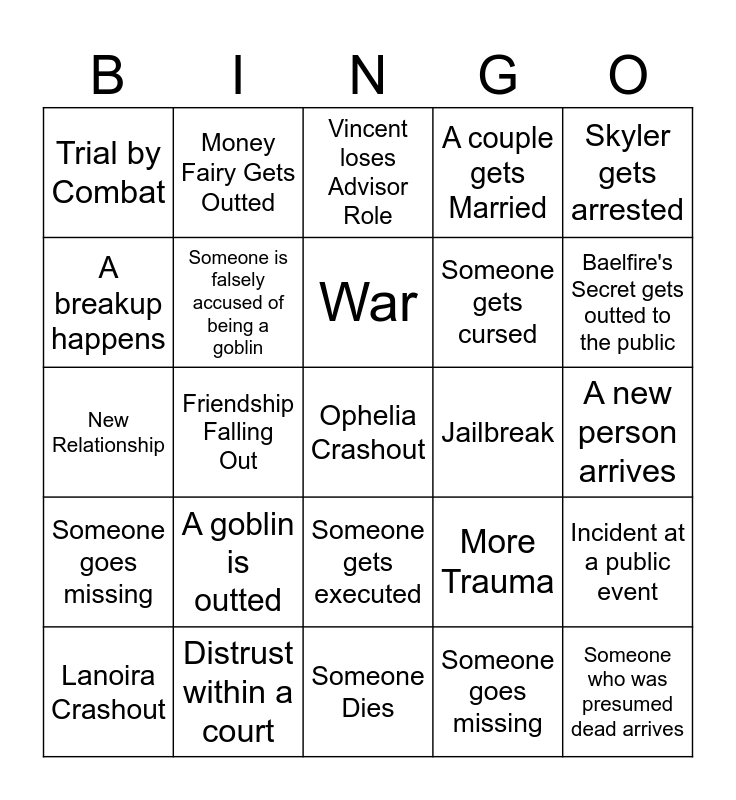 This bingo card has 25 words: A goblin is outted, Someone Dies, War, Lanoira Crashout, Skyler gets arrested, Trial by Combat, A breakup happens, Money Fairy Gets Outted, Jailbreak, Someone gets executed, Someone gets cursed, New Relationship, More Trauma, Incident at a public event, Someone is falsely accused of being a goblin, Someone who was presumed dead arrives, A new person arrives, Vincent loses Advisor Role, Baelfire's Secret gets outted to the public, Friendship Falling Out, Ophelia Crashout, Distrust within a court, Someone goes missing, A couple gets Married and Someone goes missing.