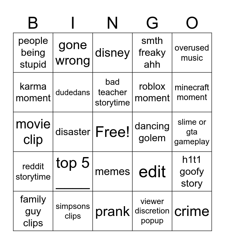This bingo card has a free space and 24 words: top 5 ____, simpsons clips, bad teacher storytime, family guy clips, overused music, people being stupid, karma moment, gone wrong, dancing golem, memes, roblox moment, movie clip, edit, h1t1 goofy story, dudedans, viewer discretion popup, slime or gta gameplay, disney, minecraft moment, disaster, crime, reddit storytime, smth freaky ahh and prank.