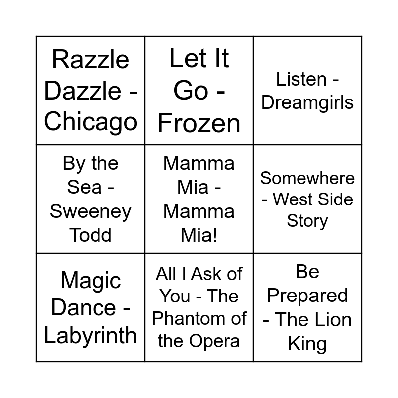This bingo card has 20 words: Get’cha Head in the Game - High School Musical, Greased Lightnin’ - Grease, Listen - Dreamgirls, Elephant Love Medley - Moulin Rouge!, You Can’t Stop the Beat - Hairspray, Mamma Mia - Mamma Mia!, The Schuyler Sisters - Hamilton, Razzle Dazzle - Chicago, Be Prepared - The Lion King, Let It Go - Frozen, Do-Re-Mi - The Sound of Music, Maybe - Annie, Somewhere - West Side Story, Mean Green Mother from Outer Space - Little Shop of Horrors, Magic Dance - Labyrinth, Sweet Transvestite - Rocky Horror Picture Show, All I Ask of You - The Phantom of the Opera, By the Sea - Sweeney Todd, Broadway Melody - Singin’ in the Rain and Breaking Free - High School Musical.