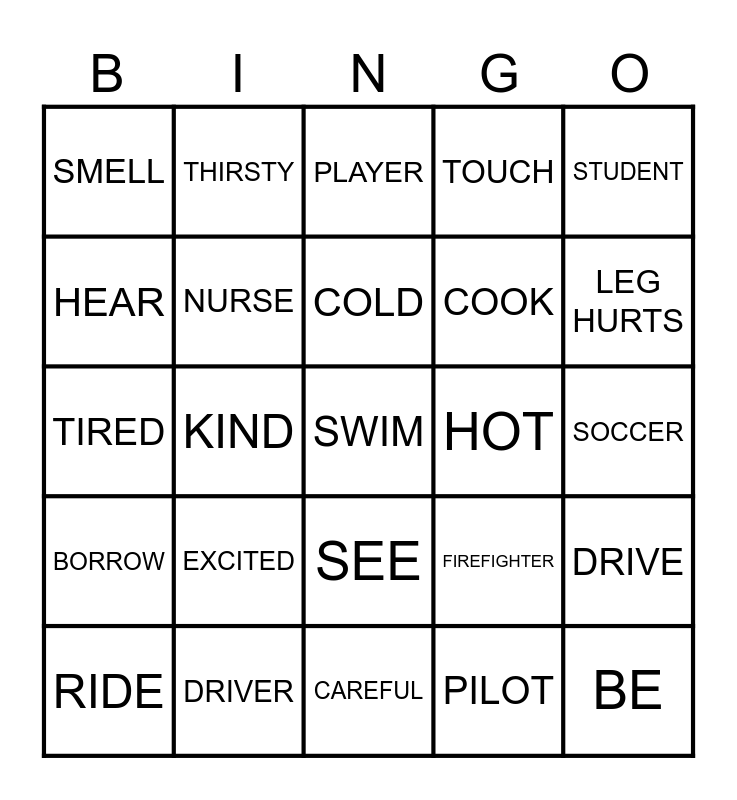 This bingo card has a free space and 24 words: RIDE, EXCITED, COLD, PILOT, STUDENT, SMELL, THIRSTY, PLAYER, HOT, SOCCER, TIRED, NURSE, FIREFIGHTER, DRIVE, HEAR, DRIVER, CAREFUL, TOUCH, LEG HURTS, BORROW, KIND, SEE, COOK and BE.