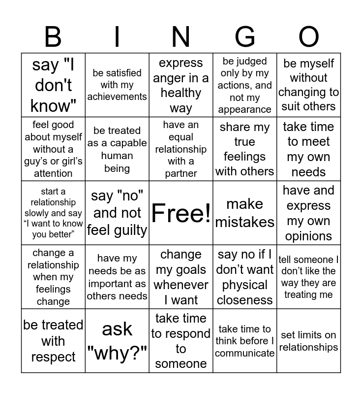 This bingo card has a free space and 29 words: be treated with respect, have and express my own feelings, say "no" and not feel guilty, change my mind, say "I don't know", express anger in a healthy way, be treated as a capable human being, have my needs be as important as others needs, make mistakes, ask "why?", have and express my own opinions, set limits on relationships, take time to respond to someone, take time to think before I communicate, take time to meet my own needs, take time to be alone, change my goals whenever I want, change a relationship when my feelings change, be myself without changing to suit others, start a relationship slowly and say “I want to know you better”, say no if I don’t want physical closeness, stand up for my beliefs and values, share my true feelings with others, feel good about myself without a guy’s or girl’s attention, be judged only by my actions, and not my appearance, be satisfied with my achievements, tell someone I don’t like the way they are treating me, have an equal relationship with a partner and feel good about myself.