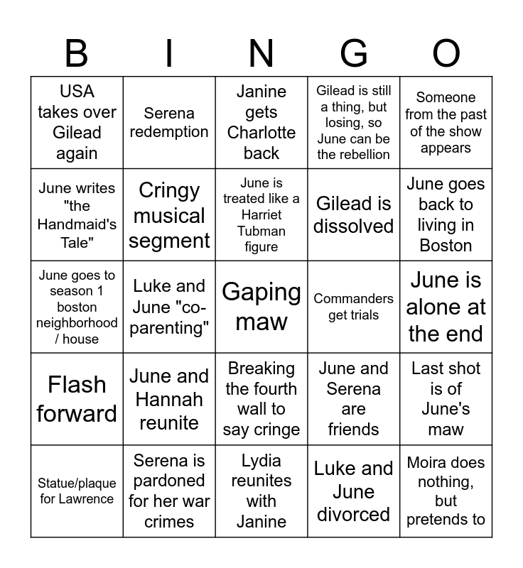 This bingo card has a free space and 24 words: June and Hannah reunite, Serena is pardoned for her war crimes, June is treated like a Harriet Tubman figure, Statue/plaque for Lawrence, Someone from the past of the show appears, USA takes over Gilead again, June writes "the Handmaid's Tale", Serena redemption, Commanders get trials, Breaking the fourth wall to say cringe, Gilead is dissolved, June goes to season 1 boston neighborhood / house, June and Serena are friends, Last shot is of June's maw, Cringy musical segment, Luke and June divorced, June is alone at the end, Janine gets Charlotte back, June goes back to living in Boston, Luke and June "co-parenting", Moira does nothing, but pretends to, Flash forward, Gilead is still a thing, but losing, so June can be the rebellion and Lydia reunites with Janine.