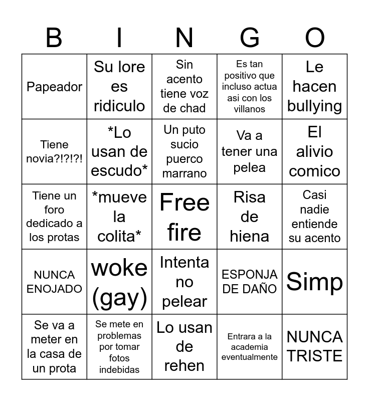 This bingo card has a free space and 24 words: woke (gay), Se mete en problemas por tomar fotos indebidas, Un puto sucio puerco marrano, Se va a meter en la casa de un prota, Le hacen bullying, Papeador, Tiene novia?!?!?!, Su lore es ridiculo, Risa de hiena, Intenta no pelear, Va a tener una pelea, Tiene un foro dedicado a los protas, ESPONJA DE DAÑO, Simp, *Lo usan de escudo*, Entrara a la academia eventualmente, Casi nadie entiende su acento, Sin acento tiene voz de chad, El alivio comico, *mueve la colita*, NUNCA TRISTE, NUNCA ENOJADO, Es tan positivo que incluso actua asi con los villanos and Lo usan de rehen.