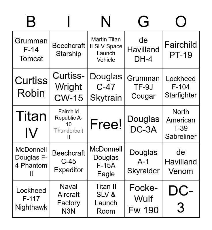 This bingo card has a free space and 48 words: Spruce Goose, DC-3, SR-71 Black Bird, Titan II SLV & Launch Room, Beechcraft C-45 Expeditor, Beechcraft Model 17, Beechcraft Starship, Consolidated PBY Catalina, Curtiss Robin, Curtiss Fledgling, Curtiss-Wright CW-15, de Havilland DH-4, de Havilland Venom, Douglas A-1 Skyraider, Douglas A-26C Invader, Douglas A-4 Skyhawk, Douglas C-47 Skytrain, Douglas DC-3A, Douglas F5D Skylancer, Fairchild PT-19, Fairchild Republic A-10 Thunderbolt II, Focke-Wulf Fw 190, Grumman F-14 Tomcat, Grumman TF-9J Cougar, Hughes H-4 Hercules, Lockheed F-104 Starfighter, Lockheed F-117 Nighthawk, Lockheed SR-71A Blackbird, McDonnell Douglas F-15A Eagle, McDonnell Douglas F-4 Phantom II, Messerschmitt Me 262, Mikoyan-Gurevich MiG-17, Mikoyan-Gurevich MiG-21MF, Mikoyan MiG-29, Naval Aircraft Factory N3N, North American F-86D Sabre, North American F-100 Super Sabre, North American T-39 Sabreliner, Northrop F-89 Scorpion, Piper L-4 Grasshopper, Ryan PT-22 Recruit, Foton-6 Space Capsule, Martin Titan II SLV Space Launch Vehicle, Mercury Space Capsule, Titan IV, NASA X-38 V-131R, PGM-11 Redstone and North American X-15.