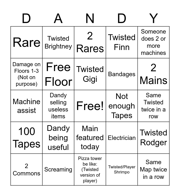 This bingo card has a free space and 29 words: 2 Commons, Main Twisted, Dandy selling useless items, Blackout, Rare, 2 Rares, Free Floor, Dandy being useful, Not enough Tapes, Screaming, Same Twisted twice in a row, Same Map twice in a row, Pizza tower be like: (Twisted version of player), Twisted/Player Shrimpo, 2 Mains, Latest Twisted added, Main featured today, 100 Tapes, Someone does 2 or more machines, Machine assist, Electrician, Rare Item, Bandages, Damage on Floors 1-3 (Not on purpose), Twisted Finn, Twisted Brightney, Twisted Rodger, Twisted Gigi and Twisted Vee.