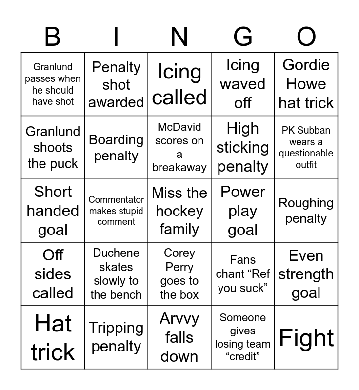 This bingo card has a free space and 25 words: Duchene skates slowly to the bench, Arvvy falls down, McDavid scores on a breakaway, Hat trick, Gordie Howe hat trick, Granlund passes when he should have shot, Granlund shoots the puck, Penalty shot awarded, Power play goal, Corey Perry goes to the box, High sticking penalty, Short handed goal, Fans chant “Ref you suck”, Even strength goal, Boarding penalty, Slashing penalty, Roughing penalty, Icing called, PK Subban wears a questionable outfit, Commentator makes stupid comment, Fight, Tripping penalty, Off sides called, Icing waved off and Someone gives losing team “credit”.