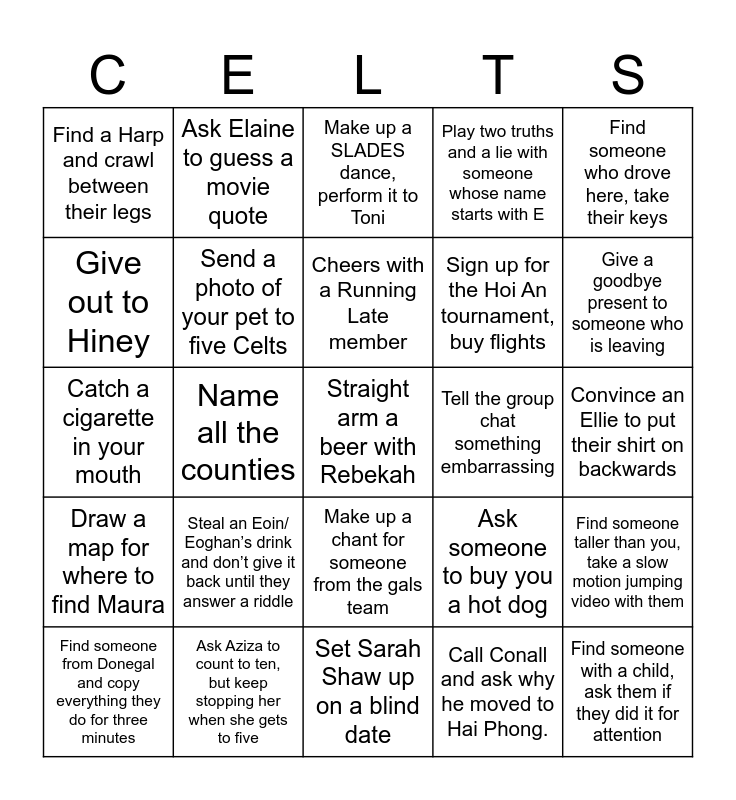This bingo card has 84 words: Propose to someone who got engaged this year, Trade Sean Foley something for a cigarette, Make up a SLADES dance, perform it to Toni, Take Eamonn’s shoe, Do a tequila shot with someone you don’t know very well, Tell Mo something you’ve done that’s Haram, Drink out of John Mullins shoe, Give Deckie (either one) a wet willie, Introduce one Conor to another Conor, Play hide and seek with a Sunday league referee, Get Katie Egan on the phone, Apologize to Dan Burke for something you’ve done, Send a photo of your pet to five Celts, Tell the group chat something embarrassing, Do a three person gymnastics trick, Find a Harp and crawl between their legs, Find someone from Donegal and copy everything they do for three minutes, Give out to Hiney, Get Eoghan Finn to call you “boss” without directly asking him to, Sit on Katie Hunts lap (ask politely first), Ask Brian how he met Aoife, Sign up for the Hoi An tournament, buy flights, Straight arm a beer with Rebekah, Replace G’s drink with water, Name all the counties, Name 30 US states (Ellie’s the judge), Stop Tash and John from kissing, Sing “There is a light that never goes out” with Simon, Steal something from John Walsh, Ask Tom Cooney where his passport is, Steal an Eoin/ Eoghan’s drink and don’t give it back until they answer a riddle, Tickle James Forrest, Do a backflip (or something equally cool), Catch a cigarette in your mouth, Find someone with a child, ask them if they did it for attention, Try and get Brian Smith to sing a duet with you without directly asking him to, Set Sarah Shaw up on a blind date, Challenge Melanie to a race, Give a goodbye present to someone who is leaving, Draw a map for where to find Maura, Talk to Joel like a little baby until he calls you out., Talk to someone in their accent until they call you out on it., Learn a TikTok dance from Anna Scott, Ask Podge how to spell his name and then tell him he’s wrong., Start a fight between Xenia and Ichi, Challenge Jason to a battle of strength, Ask Elaine to guess a movie quote, Tell Joey he has nice skin and that you’d like to wear it., Neigh like a horse to Kasia until she asks you to stop, Play rock paper scissors with Phuong, Play “Name the song” with Brid, Ask someone to buy you a hot dog, Play two truths and a lie with someone whose name starts with E, Whisper in John McDonagh’s ear “I heard you’re attracted to sonic the hedgehog”, Ask Nikki to show you her boots, Find three people in the same Harry Potter house as you, Ask Aziza to count to ten, but keep stopping her when she gets to five, Cheers with a Running Late member, Start a religious fight with a Catholic, Convince an Ellie to put their shirt on backwards, Make up a handshake with Tin, Find a CrossFit member, try to talk them out of it, Win a Teddy, Challenge Ichi to a handstand contest, Teach Emma Mullan a yoga pose, Ask Jemima to teach you ballet, Give someone a medal, Gather three friends and stage an intervention for eamonn, Find someone who drove here, take their keys, Gather the five people you’d have on your Zombie apocalypse team, do a group high five, Find someone taller than you, take a slow motion jumping video with them, Show marah a magic trick, Stand up and give a best man speech for one of the couples who is engaged, Have a conversation with Emma Hendricks in an American accent, Make up a chant for someone from the gals team, Call Conall and ask why he moved to Hai Phong., Say the alphabet backwards faster than Lauren can, Get 20k from someone with a better job than you, Get on the train to Long Island (choo Choo), Call in sick to work tomorrow, Do an animal impression for a non-irish person. Don’t stop until they guess it., Road swim, Eat something you shouldn’t and Arm wrestle with an English person.