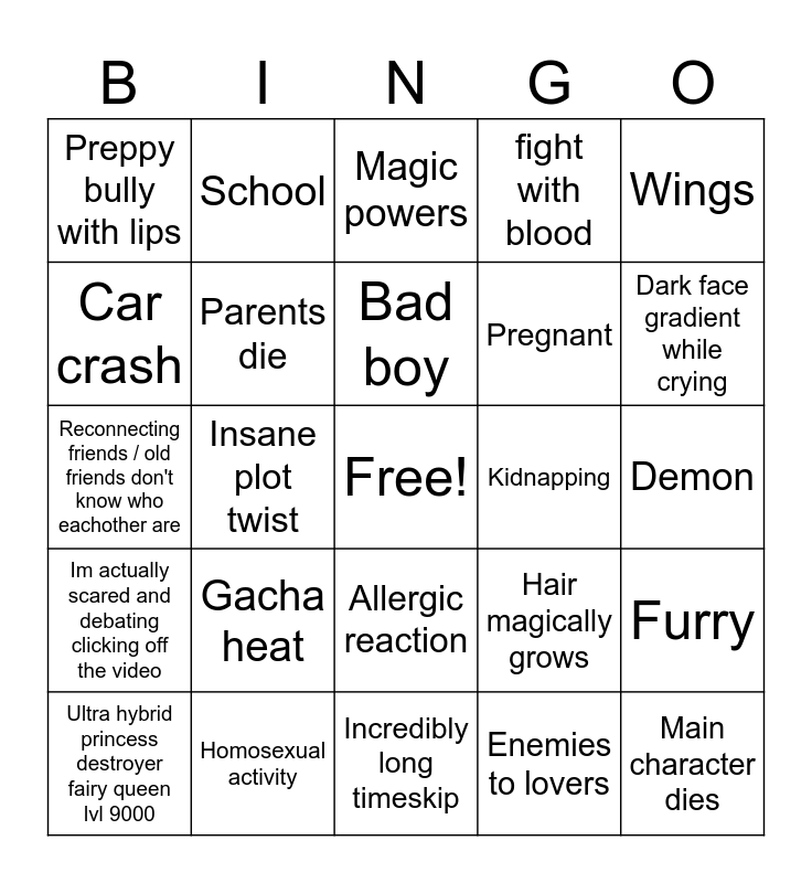 This bingo card has a free space and 24 words: Ultra hybrid princess destroyer fairy queen lvl 9000, Gacha heat, Bad boy, Enemies to lovers, Wings, Preppy bully with lips, School, Magic powers, Kidnapping, Demon, Reconnecting friends / old friends don't know who eachother are, Parents die, Hair magically grows, Furry, Car crash, Homosexual activity, Incredibly long timeskip, fight with blood, Dark face gradient while crying, Im actually scared and debating clicking off the video, Insane plot twist, Allergic reaction, Pregnant and Main character dies.