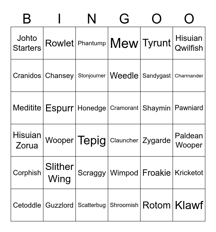 This bingo card has 36 words: Wimpod, Scraggy, Shroomish, Cranidos, Hisuian Zorua, Cramorant, Chansey, Scatterbug, Tyrunt, Froakie, Charmander, Mew, Kricketot, Espurr, Weedle, Johto Starters, Corphish, Shaymin, Meditite, Phantump, Honedge, Wooper, Clauncher, Tepig, Zygarde, Rowlet, Sandygast, Guzzlord, Stonjourner, Hisuian Qwilfish, Klawf, Cetoddle, Paldean Wooper, Pawniard, Slither Wing and Rotom.