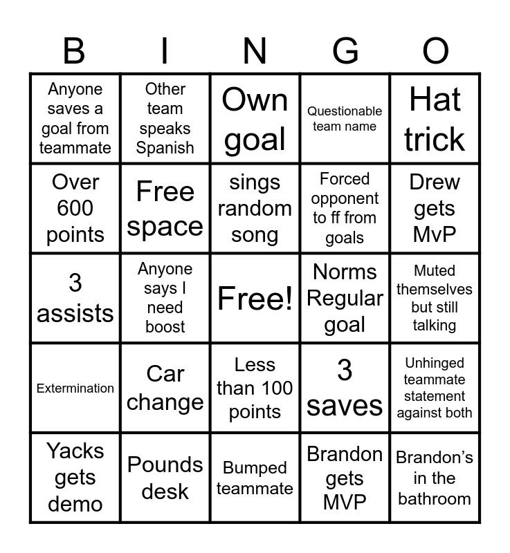 This bingo card has a free space and 29 words: Yacks gets demo, Drew says in the air, Anyone says I need boost, Misses empty net, Anyone saves a goal from teammate, Own goal, Free space, Car change, Norms Regular goal, Pounds desk, Muted themselves but still talking, Brandon’s in the bathroom, Bumped teammate, Brandon gets MVP, Drew gets MvP, Yacks gets MVP, Less than 100 points, Extermination, Hat trick, 3 assists, 3 saves, Forced opponent to ff from chat, Forced opponent to ff from goals, Over 600 points, Questionable team name, Other team speaks Spanish, Unhinged teammate statement against both, sings random song and Rage quits.