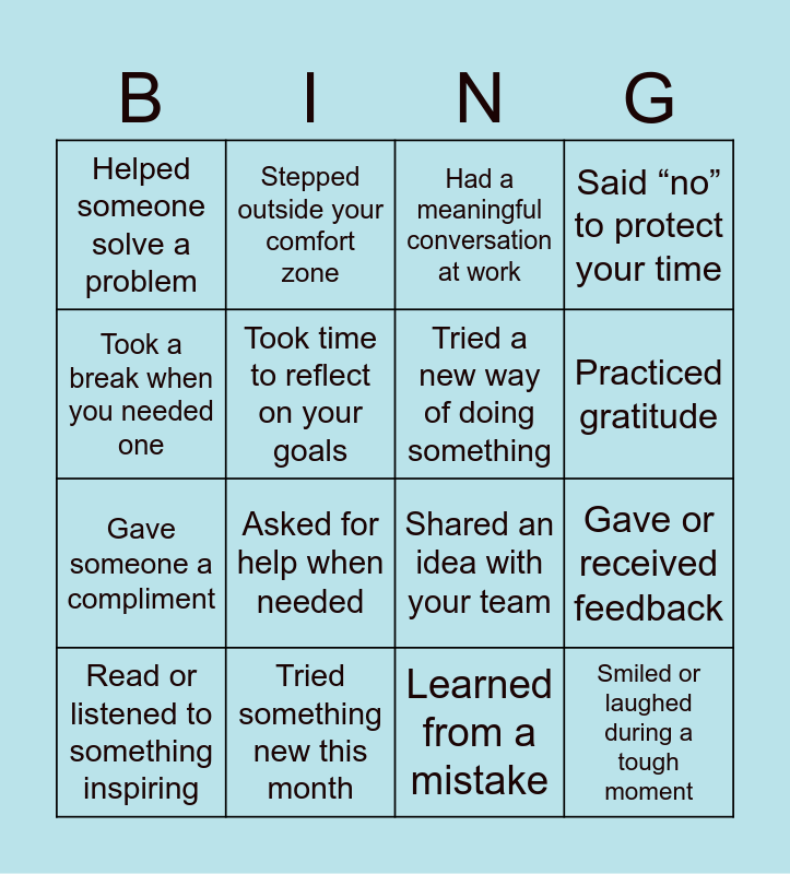 This bingo card has 16 words: Tried something new this month, Gave or received feedback, Had a meaningful conversation at work, Helped someone solve a problem, Gave someone a compliment, Stepped outside your comfort zone, Shared an idea with your team, Learned from a mistake, Took a break when you needed one, Took time to reflect on your goals, Read or listened to something inspiring, Said “no” to protect your time, Asked for help when needed, Practiced gratitude, Tried a new way of doing something and Smiled or laughed during a tough moment.