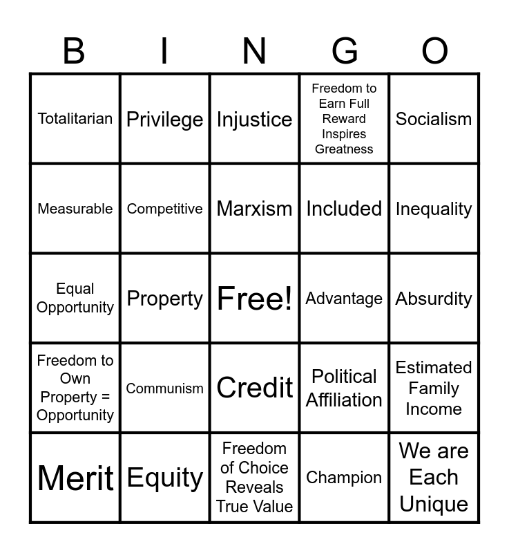 This bingo card has a free space and 24 words: Communism, Equity, Marxism, Merit, Socialism, Totalitarian, Measurable, Privilege, Advantage, Credit, Included, Equal Opportunity, Political Affiliation, Estimated Family Income, Competitive, Champion, Absurdity, Injustice, Inequality, Property, We are Each Unique, Freedom to Own Property = Opportunity, Freedom to Earn Full Reward Inspires Greatness and Freedom of Choice Reveals True Value.