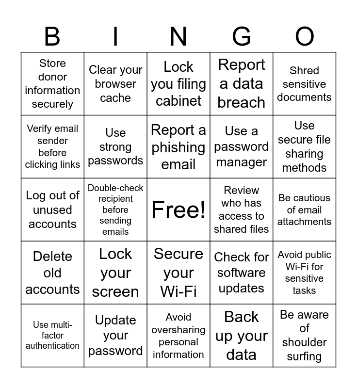 This bingo card has a free space and 24 words: Lock your screen, Update your password, Report a phishing email, Use multi-factor authentication, Shred sensitive documents, Store donor information securely, Verify email sender before clicking links, Clear your browser cache, Review who has access to shared files, Secure your Wi-Fi, Use a password manager, Log out of unused accounts, Check for software updates, Avoid public Wi-Fi for sensitive tasks, Use strong passwords, Back up your data, Be cautious of email attachments, Lock you filing cabinet, Use secure file sharing methods, Double-check recipient before sending emails, Be aware of shoulder surfing, Delete old accounts, Report a data breach and Avoid oversharing personal information.