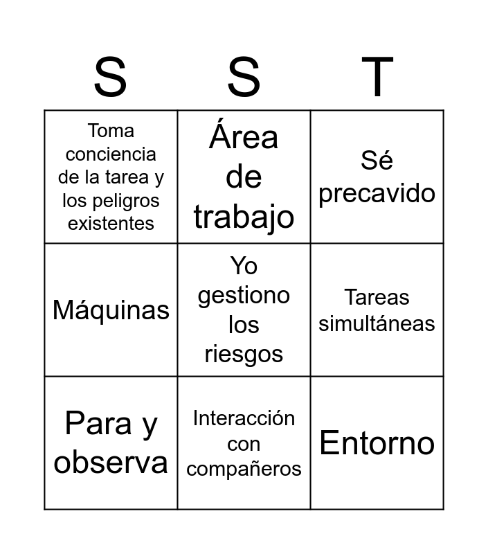 This bingo card has a free space and 29 words: Parar no parar, Se generoso. Se Solidario, Trabajo bien hecho. Trabajo seguro, Anticípate, Toma conciencia de la tarea y los peligros existentes, Sé precavido, Para y observa, Conoce lo que pasa a tu alrededor, Espacio, Ojos, Cabeza, Espalda, Oído, Manos, Piernas, Equipos/ Maquinaria en operación, Kit de primeros auxilios, Manipulación de herramientas, Entorno, Manipulación de materiales, Condiciones ambientales, Bloqueo y etiquetado, Energías a mi alrededor, Tareas simultáneas, Máquinas, Área de trabajo, Actúa, Interacción con compañeros and Epp.