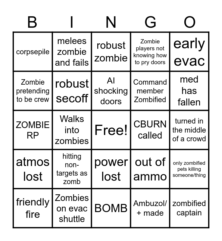 This bingo card has a free space and 29 words: friendly fire, potato aim, Walks into zombies, door moshpit, corpsepile, robust zombie, robust secoff, hitting non-targets as zomb, CBURN called, Zombies on evac shuttle, turned in the middle of a crowd, zombified captain, BOMB, Ambuzol/ + made, med has fallen, zombie with gun (shooting while alive), power lost, atmos lost, early evac, ZOMBIE RP, out of ammo, cburn/sec killing crew, Command member Zombified, Zombie pretending to be crew, Zombie players not knowing how to pry doors, melees zombie and fails, only zombified pets killing someone/thing, AI shocking doors and AI accidentally killing someone.