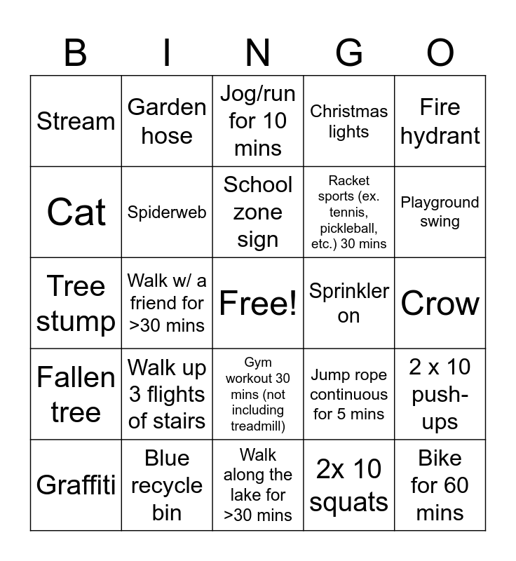 This bingo card has a free space and 24 words: Walk up 3 flights of stairs, Blue recycle bin, School zone sign, Graffiti, Fire hydrant, Stream, Cat, Garden hose, Sprinkler on, Gym workout 30 mins (not including treadmill), Racket sports (ex. tennis, pickleball, etc.) 30 mins, Tree stump, Jump rope continuous for 5 mins, 2 x 10 push-ups, Spiderweb, 2x 10 squats, Crow, Jog/run for 10 mins, Playground swing, Walk w/ a friend for >30 mins, Bike for 60 mins, Fallen tree, Christmas lights and Walk along the lake for >30 mins.