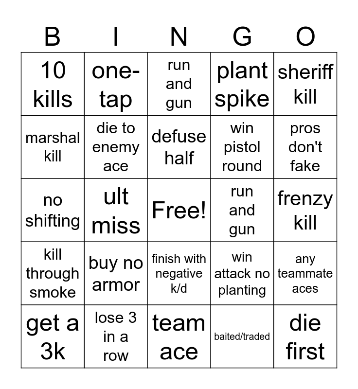 This bingo card has a free space and 24 words: buy no armor, lose 3 in a row, defuse half, get a 3k, sheriff kill, 10 kills, marshal kill, one-tap, run and gun, finish with negative k/d, win pistol round, no shifting, win attack no planting, any teammate aces, die to enemy ace, baited/traded, frenzy kill, run and gun, pros don't fake, ult miss, die first, kill through smoke, plant spike and team ace.