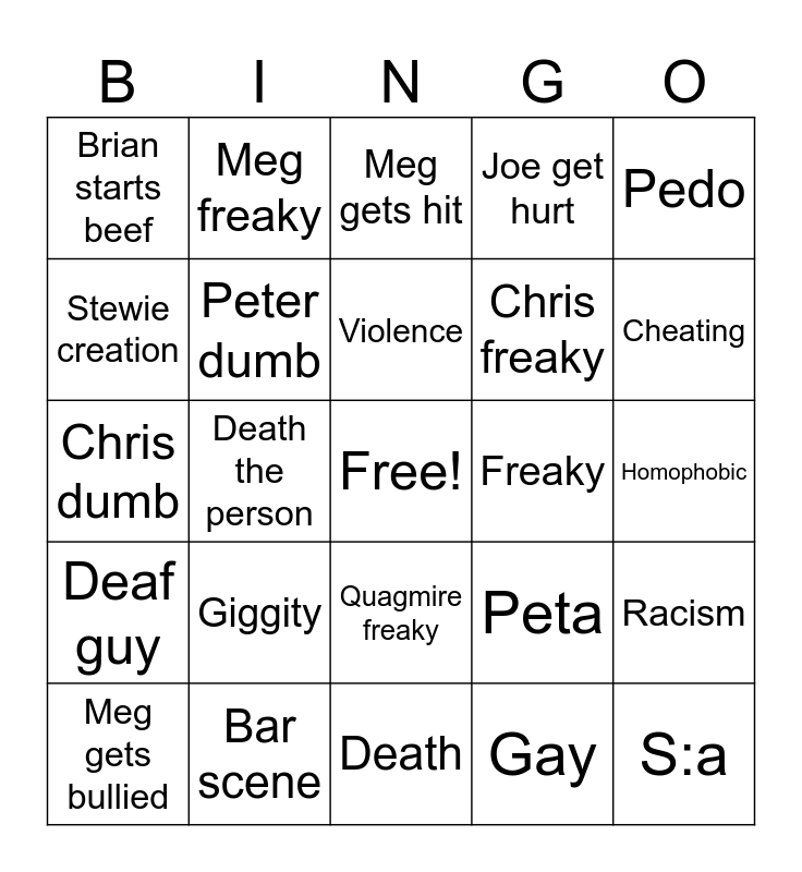 This bingo card has a free space and 24 words: Giggity, Bar scene, Violence, Meg gets bullied, Pedo, Brian starts beef, Stewie creation, Meg freaky, Freaky, Quagmire freaky, Chris freaky, Chris dumb, Peta, Racism, Peter dumb, Gay, Homophobic, Meg gets hit, Cheating, Death the person, S:a, Deaf guy, Joe get hurt and Death.