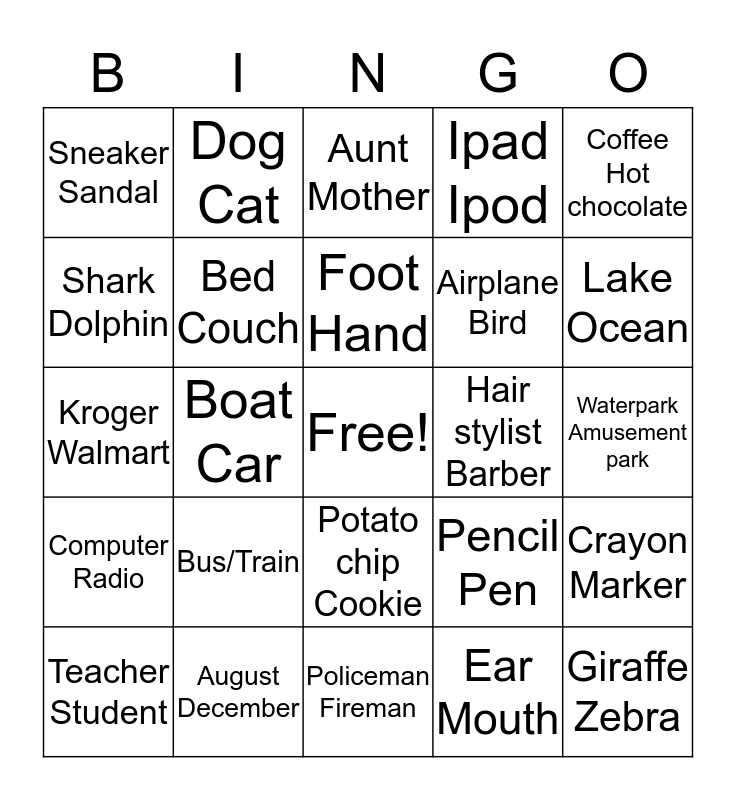 This bingo card has a free space and 24 words: Bus/Train, August December, Foot Hand, Teacher Student, Coffee Hot chocolate, Sneaker Sandal, Shark Dolphin, Dog Cat, Hair stylist Barber, Potato chip Cookie, Airplane Bird, Kroger Walmart, Pencil Pen, Crayon Marker, Bed Couch, Ear Mouth, Waterpark Amusement park, Aunt Mother, Lake Ocean, Boat Car, Giraffe Zebra, Computer Radio, Ipad Ipod and Policeman Fireman.