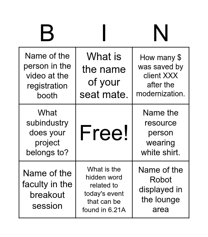 This bingo card has a free space and 8 words: Name the resource person wearing white shirt., How many $ was saved by client XXX after the modernization., What is the name of your seat mate., Name of the faculty in the breakout session, Name of the person in the video at the registration booth, Name of the Robot displayed in the lounge area, What subindustry does your project belongs to? and What is the hidden word related to today's event that can be found in 6.21A.