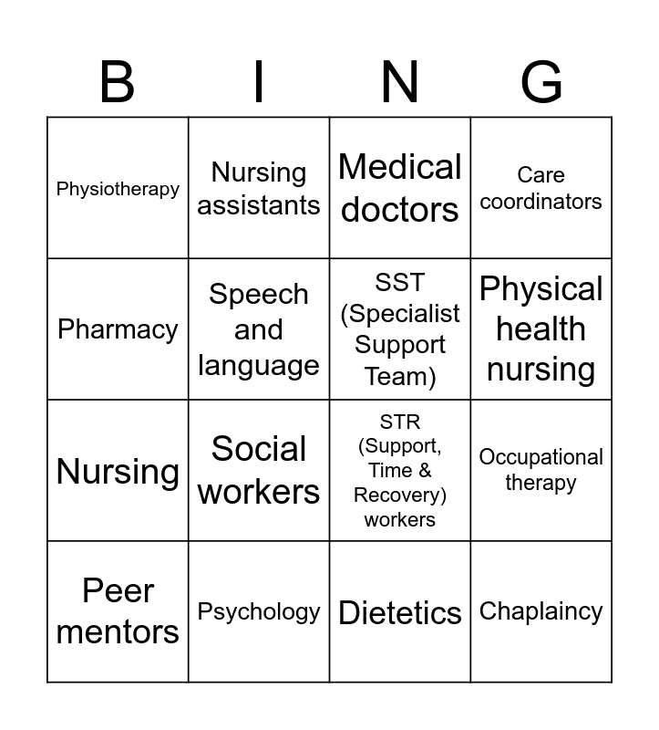 This bingo card has 16 words: Psychology, Occupational therapy, Medical doctors, Physiotherapy, Nursing, Nursing assistants, STR (Support, Time & Recovery) workers, Dietetics, Pharmacy, Speech and language, Peer mentors, Care coordinators, Social workers, Physical health nursing, SST (Specialist Support Team) and Chaplaincy.