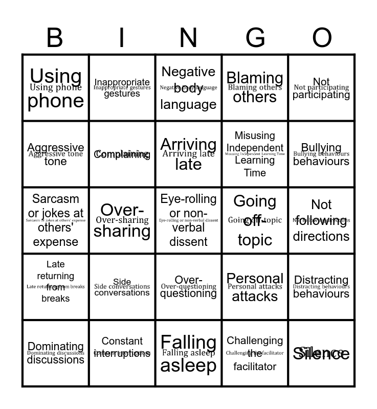 This bingo card has 24 images, a free space and 24 words: Side conversations, Constant interruptions, Arriving late, Dominating discussions, Not participating, Using phone, Aggressive tone, Inappropriate gestures, Going off-topic, Over-questioning, Misusing Independent Learning Time, Sarcasm or jokes at others' expense, Personal attacks, Distracting behaviours, Complaining, Challenging the facilitator, Not following directions, Negative body language, Bullying behaviours, Over-sharing, Silence, Late returning from breaks, Blaming others and Falling asleep.