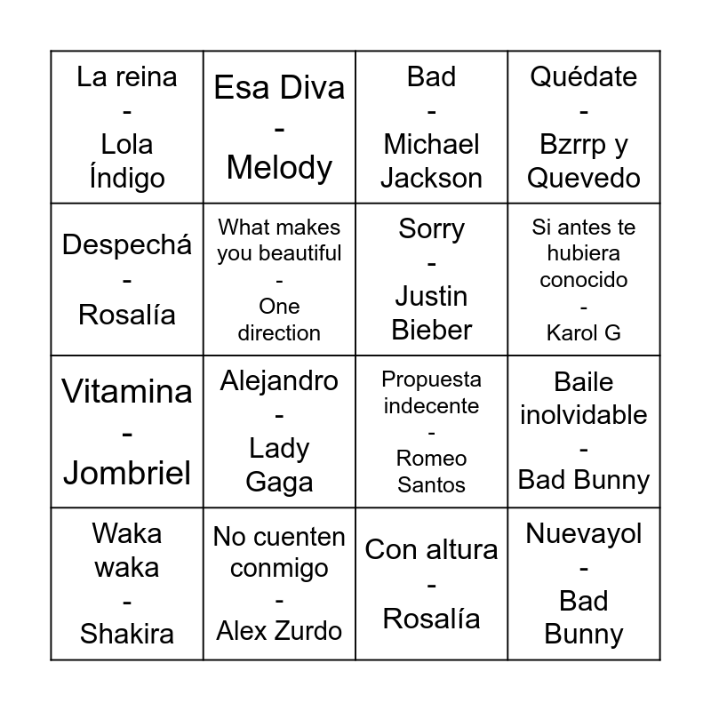 This bingo card has 18 words: Alejandro - Lady Gaga, Nuevayol - Bad Bunny, Bad - Michael Jackson, La reina - Lola Índigo, Propuesta indecente - Romeo Santos, Quédate - Bzrrp y Quevedo, Waka waka - Shakira, Esa Diva - Melody, Si antes te hubiera conocido - Karol G, Vitamina - Jombriel, Con altura - Rosalía, Despechá - Rosalía, Baile inolvidable - Bad Bunny, What makes you beautiful - One direction, Sorry - Justin Bieber, Dios está aquí - Toti, No cuenten conmigo - Alex Zurdo and Huracán - Hakuna.