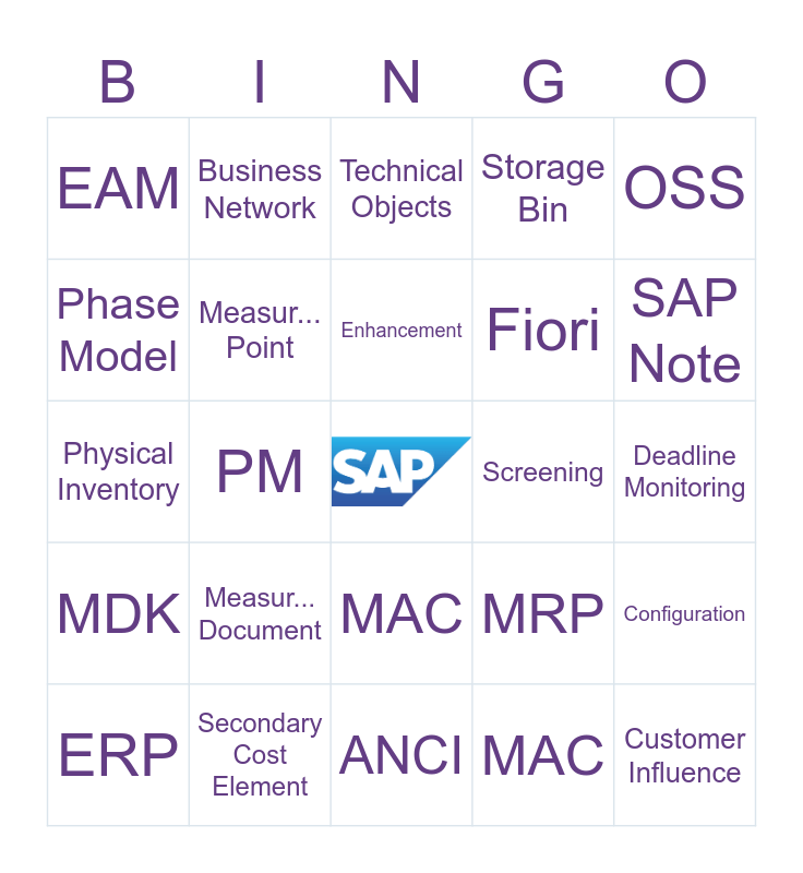 This bingo card has a free space and 29 words: ERP, CMMS, PM, MM, EAM, Technical Objects, Measur... Point, Measur... Document, Screening, Secondary Cost Element, Deadline Monitoring, Customer Influence, ANCI, MAC, SAP Note, ATI, MAC, MDK, OSS, Physical Inventory, MRP, Basis, Fiori, Phase Model, Storage Bin, Business Network, Configuration, Enhancement and Customisation.