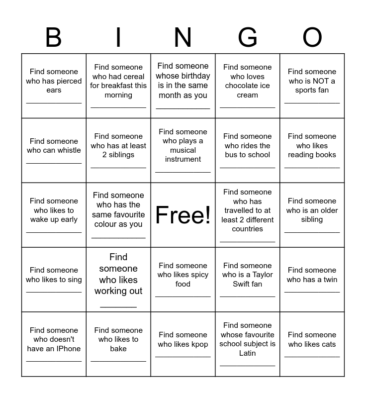 This bingo card has a free space and 29 words: Find someone who doesn't have an IPhone _____________, Find someone who is left-handed _____________, Find someone who has the same favourite colour as you ____________, Find someone who speaks more than 1 language _____________, Find someone who has pierced ears _____________, Find someone whose birthday is in the same month as you ____________, Find someone who has at least 2 siblings _____________, Find someone who likes working out _______, Find someone who has travelled to at least 2 different countries _____________, Find someone who likes to bake _____________, Find someone who is an older sibling _____________, Find someone who likes cats _____________, Find someone who likes kpop _____________, Find someone whose favourite school subject is Latin _____________, Find someone who likes reading books _____________, Find someone who likes to create art _____________, Find someone who likes spicy food _____________, Find someone who likes to sing _____________, Find someone who is NOT a sports fan _____________, Find someone who likes to wake up early _____________, Find someone who is a Taylor Swift fan _____________, Find someone who was not born in Sydney _____________, Find someone who rides the bus to school _____________, Find someone who can whistle _____________, Find someone who loves chocolate ice cream _____________, Find someone who had cereal for breakfast this morning _____________, Find someone who has a twin _____________, Find someone who plays a musical instrument _____________ and Find someone who has had stitches _____________.