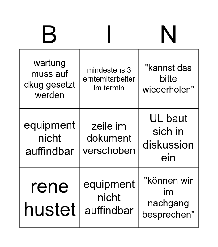 This bingo card has 9 words: rene hustet, "kannst das bitte wiederholen", mindestens 3 erntemitarbeiter im termin, equipment nicht auffindbar, wartung muss auf dkug gesetzt werden, UL baut sich in diskussion ein, zeile im dokument verschoben, "können wir im nachgang besprechen" and equipment nicht auffindbar.