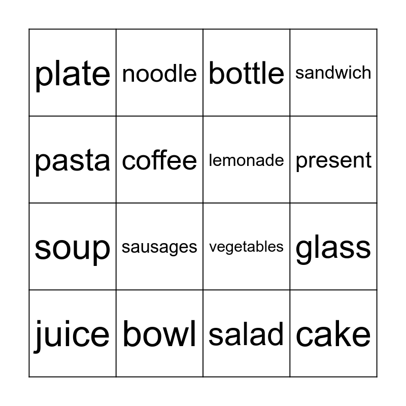 This bingo card has 16 words: bowl, glass, bottle, plate, soup, noodle, vegetables, salad, pasta, coffee, juice, sandwich, sausages, present, lemonade and cake.