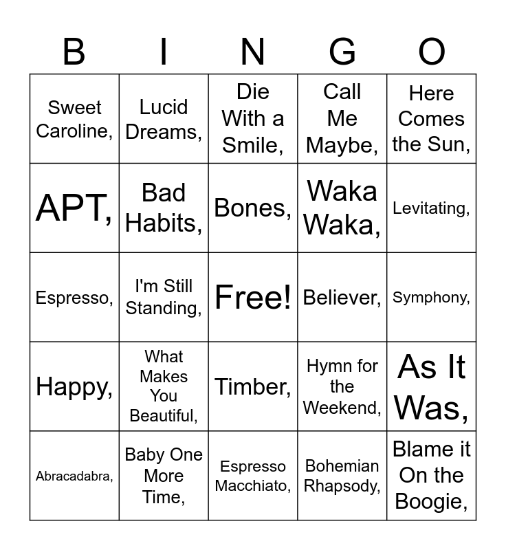 This bingo card has a free space and 47 words: Tomorrow,, Blame it On the Boogie,, Flowers,, Espresso Macchiato,, What Makes You Beautiful,, Heatwaves,, Lucid Dreams,, Beautiful Things,, APT,, Uptown Funk,, Bad Habits,, Call Me Maybe,, As It Was,, Hymn for the Weekend,, I'm A Believer,, Sky Full of Stars,, Bones,, Believer,, Shut Up and Dance,, Here Comes the Sun,, I'm Still Standing,, Bohemian Rhapsody,, Sweet Caroline,, Waka Waka,, Despacito,, Levitating,, Abracadabra,, Pink Pony Club,, Timber,, Happy,, Thriller,, Green Green Grass,, Everybody (Backstreet's Back),, Bye Bye Bye,, Ghostbusters,, Baby One More Time,, Symphony,, Never Gonna Give You Up,, Watermelon Sugar,, Thunder,, Can't Stop the Feeling,, Die With a Smile,, Espresso,, Blinding Lights,, All Star,, Sunshine, and September.