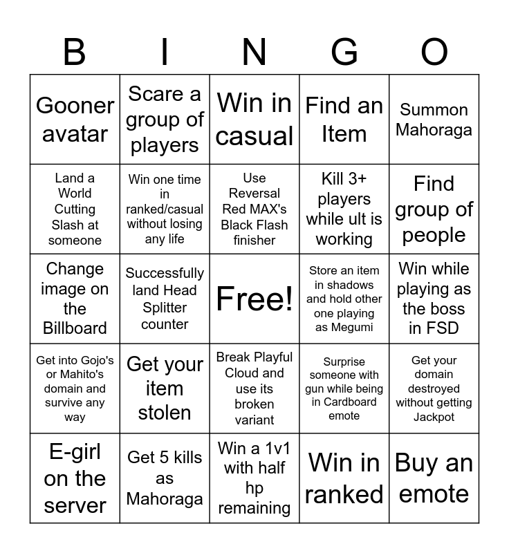 This bingo card has a free space and 44 words: Join Italian server and write random brainrot, Buy an emote, Get that kill number, that can be divided by 100 (In game, ofc), E-girl on the server, Someone is toxic in chat, Win in ranked, Win in casual, Get 1st place in roulette, Summon Mahoraga, Get 5 kills as Mahoraga, Find an Item, Store an item in shadows and hold other one playing as Megumi, Break Playful Cloud and use its broken variant, Get your item stolen, Buy Cola and regenerate HP to max, Win a 1v1 with half hp remaining, Win in 1v1 against Ult user, Change image on the Billboard, Get 1-3rd place in SWP, Find group of people, Scare a group of players, Play piano to 3+ players, Talk with someone with Message emote, Gooner avatar, Make Conga train of 3+ players, Win while playing as the boss in FSD, Get Jackpot as Hakari, Find 2 items in same place, Surprise someone with gun while being in Cardboard emote, Get into Gojo's or Mahito's domain and survive any way, Get Jackpot first try, Get your domain destroyed without getting Jackpot, Invade a domain with Megumi's Shadow Swarm move, Get Mahito's second Awakening, Successfully land Head Splitter counter, Successfully land Todo's "Brothers" move, Use 4th Black Flash while playing as Yuji, Create 200% Hollow Purple, Use Reversal Red MAX's Black Flash finisher, Land a World Cutting Slash at someone, Kill 3+ players while ult is working, Successfully get someone caught in your Unrestricted Density, Win one time in ranked/casual without losing any life and Land Todo's Black Flash finisher.