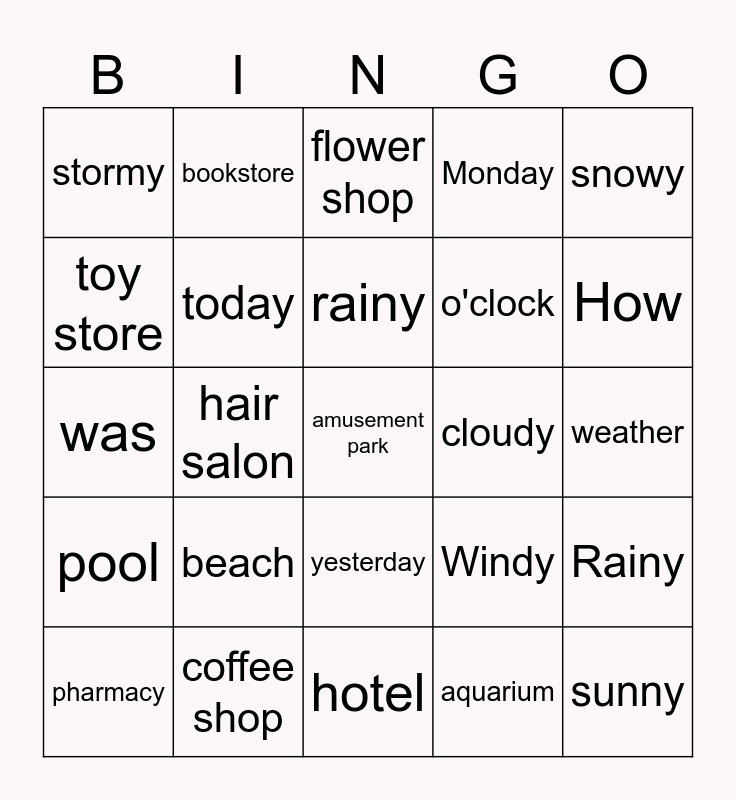 This bingo card has a free space and 24 words: beach, coffee shop, rainy, pharmacy, snowy, stormy, toy store, bookstore, cloudy, yesterday, o'clock, was, Windy, Rainy, today, aquarium, weather, flower shop, How, hair salon, sunny, pool, Monday and hotel.