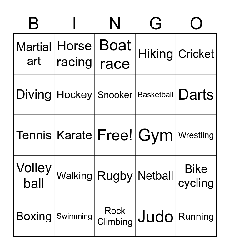 This bingo card has a free space and 34 words: Football, Judo, Weightlifting, Golf, Volley ball, Hockey, Cricket, Boxing, Horse racing, Fencing, Snooker, Boat race, Yoga, Rowing, Gym, Darts, Swimming, Tennis, Walking, Netball, Rugby, Fishing, Martial art, Wrestling, Rock Climbing, Running, Hiking, Paint balling, Basketball, Diving, Bobsleigh, Karate, Bike cycling and Archery.