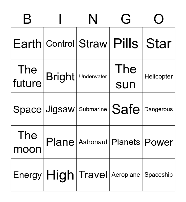 This bingo card has a free space and 29 words: Energy, Low, Jigsaw, Paw, Earth, Straw, Bright, Plane, Safe, High, Dangerous, Spaceship, Travel, Aeroplane, Helicopter, Rocket, Astronaut, The moon, Star, Space, Planets, Satellite, The sun, The future, Pills, Control, Power, Underwater and Underground.