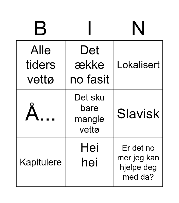 This bingo card has a free space and 8 words: Slavisk, Lokalisert, Det ække no fasit, Kapitulere, Alle tiders vettø, Er det no mer jeg kan hjelpe deg med da?, Å... and Hei hei.
