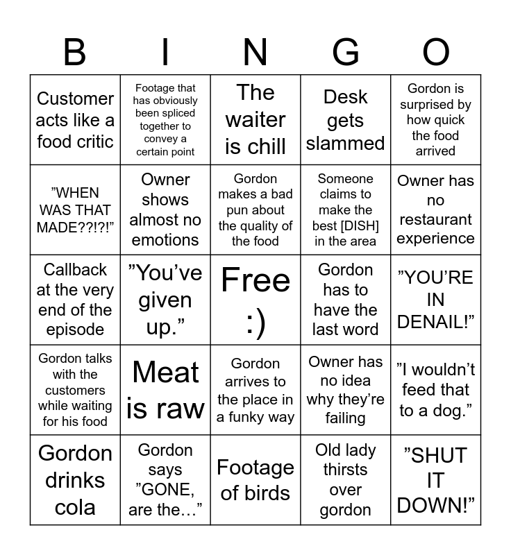 This bingo card has a free space and 24 words: Meat is raw, Gordon says ”GONE, are the…”, Gordon makes a bad pun about the quality of the food, Gordon drinks cola, Gordon is surprised by how quick the food arrived, Customer acts like a food critic, ”WHEN WAS THAT MADE??!?!”, Footage that has obviously been spliced together to convey a certain point, Gordon has to have the last word, Gordon arrives to the place in a funky way, Someone claims to make the best [DISH] in the area, Callback at the very end of the episode, Owner has no idea why they’re failing, ”I wouldn’t feed that to a dog.”, Owner shows almost no emotions, Old lady thirsts over gordon, ”YOU’RE IN DENAIL!”, The waiter is chill, Owner has no restaurant experience, ”You’ve given up.”, ”SHUT IT DOWN!”, Gordon talks with the customers while waiting for his food, Desk gets slammed and Footage of birds.