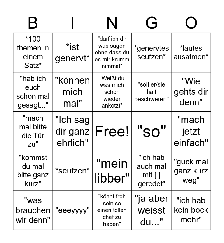 This bingo card has a free space and 24 words: *seufzen*, "eeeyyyy", "Weißt du was mich schon wieder ankotzt", "was brauchen wir denn", *lautes ausatmen*, *100 themen in einem Satz*, "hab ich euch schon mal gesagt...", *ist genervt*, "so", "mein libber", "soll er/sie halt beschweren", "mach mal bitte die Tür zu", "ich hab auch mal mit [ ] geredet", "guck mal ganz kurz weg", "können mich mal", "ja aber weisst du...", "mach jetzt einfach", "darf ich dir was sagen ohne dass du es mir krumm nimmst", "Wie gehts dir denn", "Ich sag dir ganz ehrlich", "ich hab kein bock mehr", "kommst du mal bitte ganz kurz", *genervtes seufzen* and "könnt froh sein so einen tollen chef zu haben".