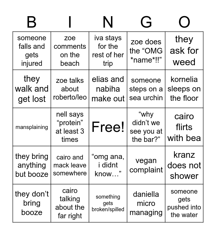 This bingo card has a free space and 24 words: cairo and mack leave somewhere, cairo talking about the far right, elias and nabiha make out, they don’t bring booze, they ask for weed, someone falls and gets injured, they walk and get lost, zoe comments on the beach, “why didn’t we see you at the bar?”, “omg ana, i didnt know…”, someone steps on a sea urchin, mansplaining, vegan complaint, kranz does not shower, zoe talks about roberto/leo, daniella micro managing, cairo flirts with bea, iva stays for the rest of her trip, kornelia sleeps on the floor, nell says “protein” at least 3 times, someone gets pushed into the water, they bring anything but booze, zoe does the “OMG *name*!!” and something gets broken/spilled.