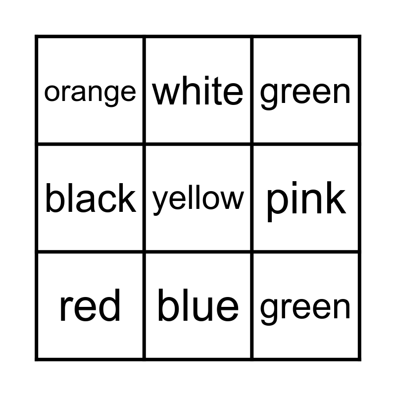 ⚠ This card has duplicate items: black (2), grey (2), white (2), brown (2), pink (2), red (2), orange (2), green (2), blue (2), purple (2)