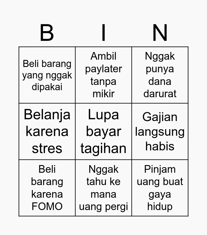 This bingo card has a free space and 8 words: Belanja karena stres, Ambil paylater tanpa mikir, Gajian langsung habis, Beli barang karena FOMO, Nggak punya dana darurat, Beli barang yang nggak dipakai, Nggak tahu ke mana uang pergi and Pinjam uang buat gaya hidup.