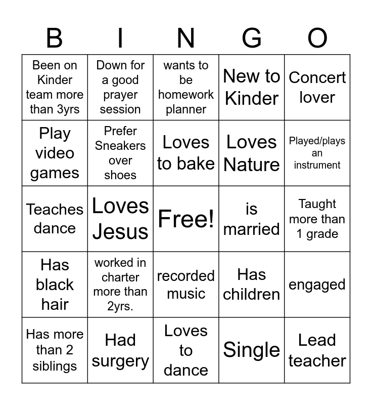 This bingo card has a free space and 24 words: worked in charter more than 2yrs., Had surgery, Loves to bake, Has more than 2 siblings, Concert lover, Been on Kinder team more than 3yrs, Play video games, Down for a good prayer session, is married, recorded music, Loves Nature, Teaches dance, Has children, engaged, Prefer Sneakers over shoes, Single, Taught more than 1 grade, wants to be homework planner, Played/plays an instrument, Loves Jesus, Lead teacher, Has black hair, New to Kinder and Loves to dance.