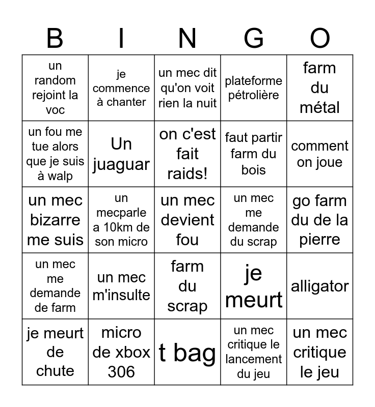This bingo card has a free space and 24 words: un mec m'insulte, micro de xbox 306, on c'est fait raids!, je meurt de chute, farm du métal, un random rejoint la voc, un fou me tue alors que je suis à walp, je commence à chanter, un mec me demande du scrap, farm du scrap, faut partir farm du bois, un mec bizarre me suis, je meurt, alligator, Un juaguar, un mec critique le lancement du jeu, go farm du de la pierre, un mec dit qu'on voit rien la nuit, comment on joue, un mecparle a 10km de son micro, un mec critique le jeu, un mec me demande de farm, plateforme pétrolière and t bag.