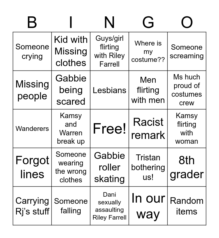 This bingo card has a free space and 24 words: Someone wearing the wrong clothes, Someone falling, Lesbians, Carrying Rj’s stuff, Someone screaming, Someone crying, Missing people, Kid with Missing clothes, Racist remark, Gabbie roller skating, Men flirting with men, Wanderers, Tristan bothering us!, 8th grader, Gabbie being scared, In our way, Kamsy flirting with woman, Guys/girl flirting with Riley Farrell, Ms huch proud of costumes crew, Kamsy and Warren break up, Random items, Forgot lines, Where is my costume?? and Dani sexually assaulting Riley Farrell.