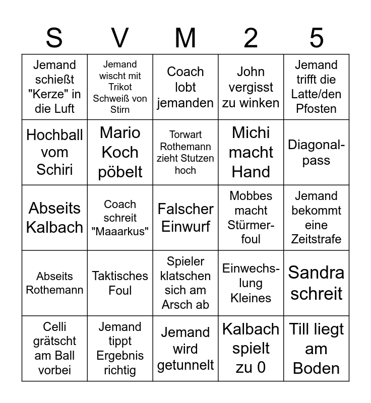 This bingo card has a free space and 24 words: Taktisches Foul, Jemand tippt Ergebnis richtig, Torwart Rothemann zieht Stutzen hoch, Celli grätscht am Ball vorbei, Jemand trifft die Latte/den Pfosten, Jemand schießt "Kerze" in die Luft, Hochball vom Schiri, Jemand wischt mit Trikot Schweiß von Stirn, Mobbes macht Stürmer-foul, Spieler klatschen sich am Arsch ab, Michi macht Hand, Abseits Kalbach, Einwechs-lung Kleines, Sandra schreit, Mario Koch pöbelt, Kalbach spielt zu 0, Jemand bekommt eine Zeitstrafe, Coach lobt jemanden, Diagonal-pass, Coach schreit "Maaarkus", Till liegt am Boden, Abseits Rothemann, John vergisst zu winken and Jemand wird getunnelt.